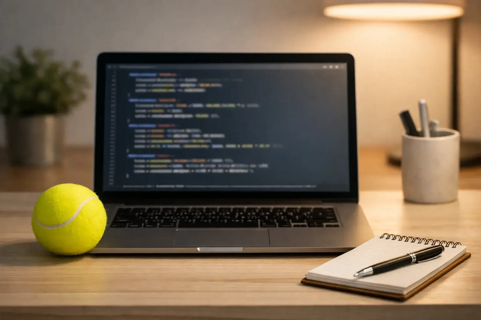 Schermo di un laptop che mostra righe di codice Python con una pallina da tennis sulla scrivania